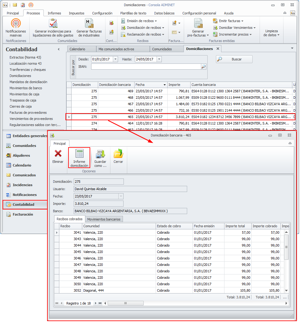 El informe de domiciliación se obtiene desde el apartado Domiciliaciones del menú Contabilidad. En la ficha de la domiciliación se encuentra el botón Informe domiciliación.