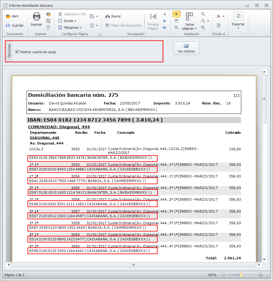 Al imprimir el informe de la domiciliación se puede activar la casilla "Incluir cuenta domiciliada". En ese caso el informe añade una línea más por cada recibo en la que se muestra la cuenta bancaria del pagador.