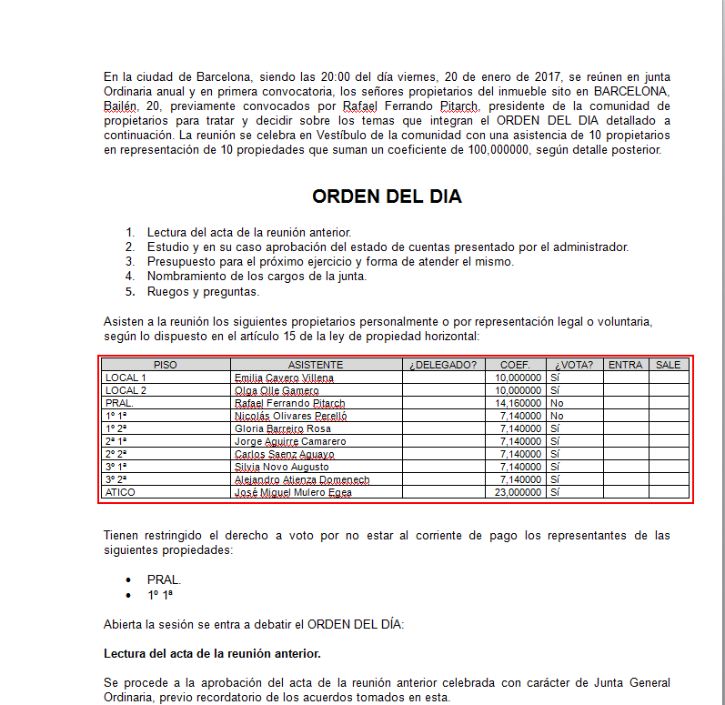 La relación de asistentes a la reunión pasa a mostrarse en el documento de forma ordenada, clasificada por dirección y orden de departamento.
