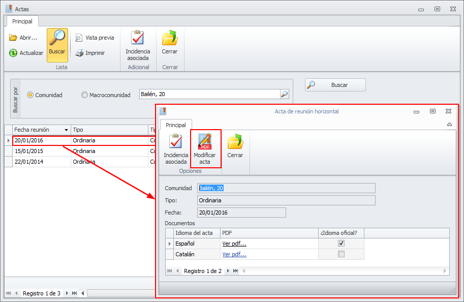 En la ventana que muestra las actas cerradas, se ha añadido un botón que permite volver a abrir el acta, realizar las modificaciones necesarias y volver a cerrar el acta.