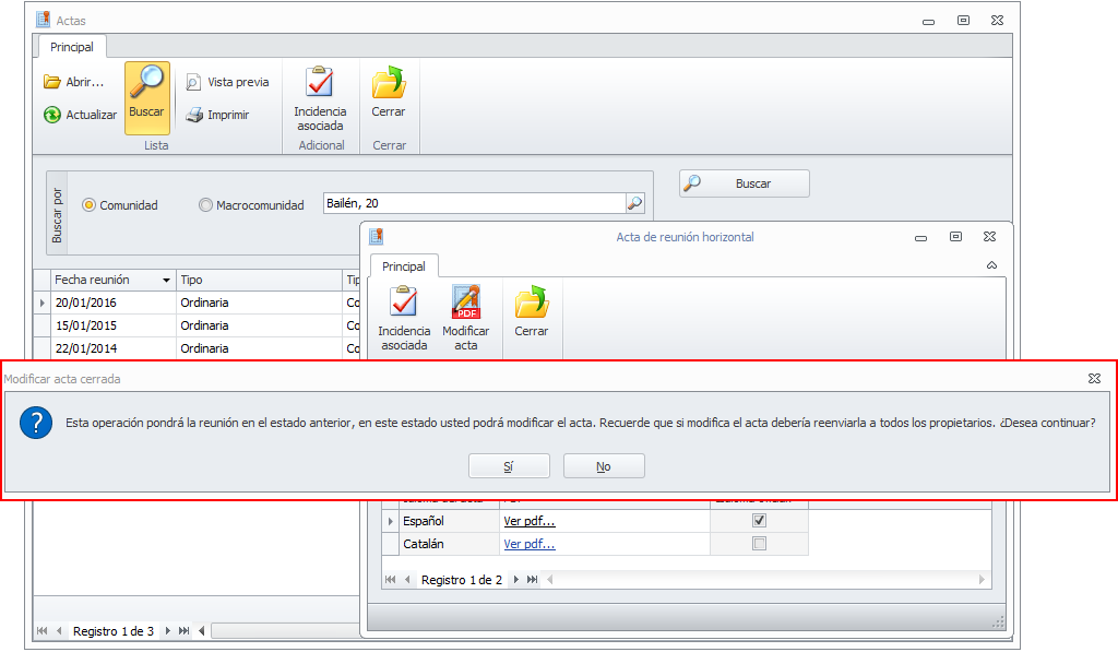 Al hacer clic en este botón se muestra una ventana recordando al usuario que la modificación del acta implica volverla al estado anterior (pendiente de cerrar) y que tras la modificación deberá volver a remitirla a los copropietarios y cerrarla.