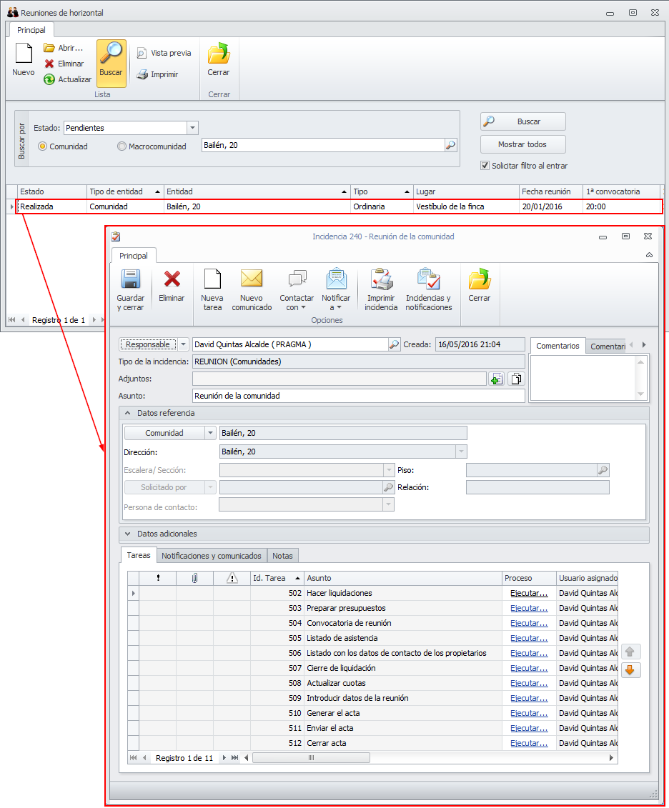 Al hacer clic en Sí, el acta desaparece de la lista de actas cerradas. El acta vuelve a estar en la sección de Reuniones. Cuando se abre esa reunión se accede a la incidencia que contiene los procesos de la misma. Aunque las tareas aparezcan como completadas, puede acceder a ellas con toda normalidad.