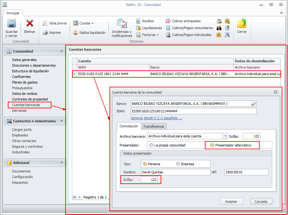 La ficha de la cuenta bancaria de la comunidad permite indicar que se desea crear un archivo individual de remesa de domiciliación y/o transferencias para esa cuenta bancaria. En ese caso se permite también indicar si el presentador de ese soporte será la propia comunidad (o macrocomunidad) o si se debe asignar un presentador alternativo (anteriormente se denominaba presentador específico, pero se ha cambiado para hacerlo más comprensible).