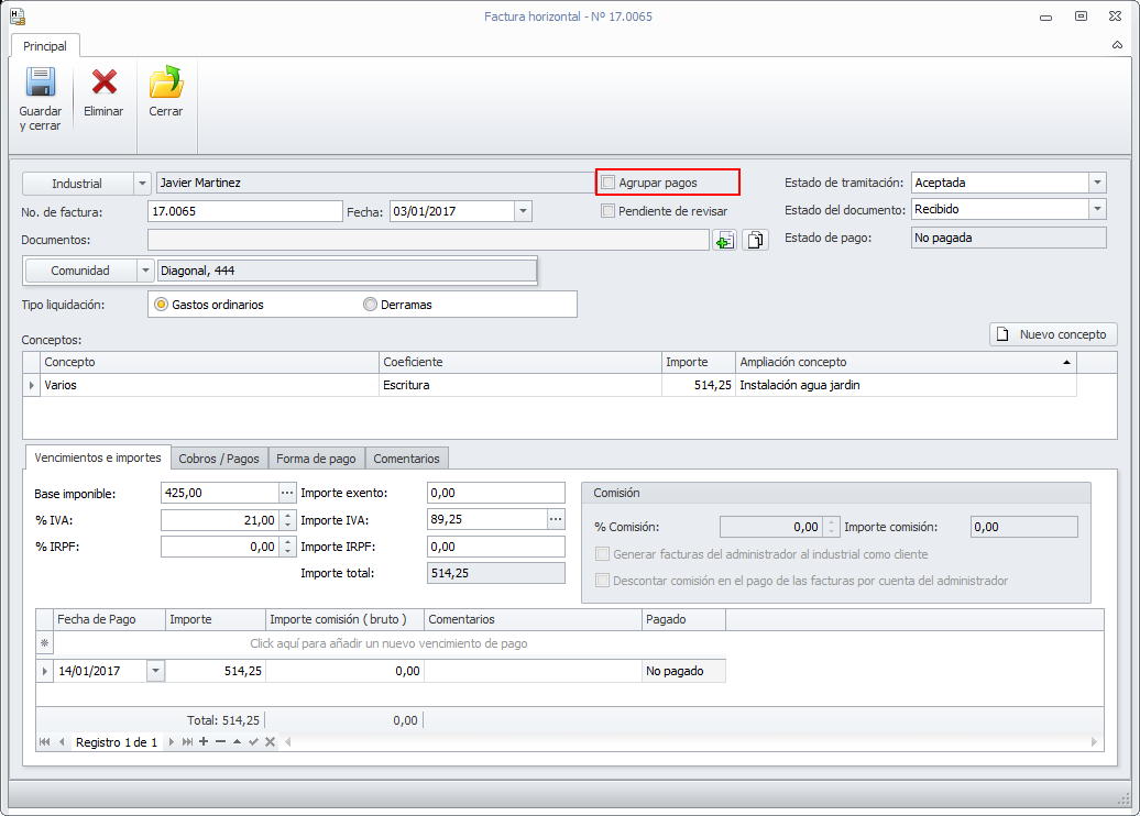Las facturas que se registran guardan dentro de su ficha si se deben agrupar los pagos o no, según se haya indicado en la ficha del industrial, para que los diferentes procedimientos de pago de facturas actuaran en consecuencia. Este dato Agrupar pagos en la factura no era visible para el usuario. A partir de ahora no sólo será visible, sino que también se podrá cambiar su valor y así incluir o retirar una factura de la agrupación general de pagos.