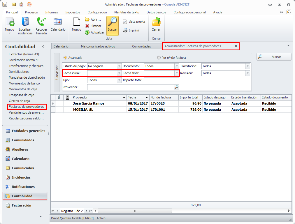 En el apartado Facturas de proveedores de la sección Contabilidad se ha añadido un nuevo criterio de búsqueda por fecha de factura.