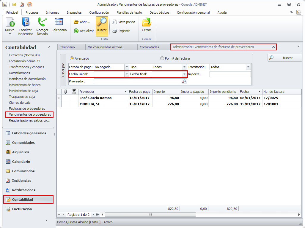 En el apartado Vencimientos de proveedores de la sección Contabilidad se ha añadido un nuevo criterio de búsqueda por fecha de factura.
