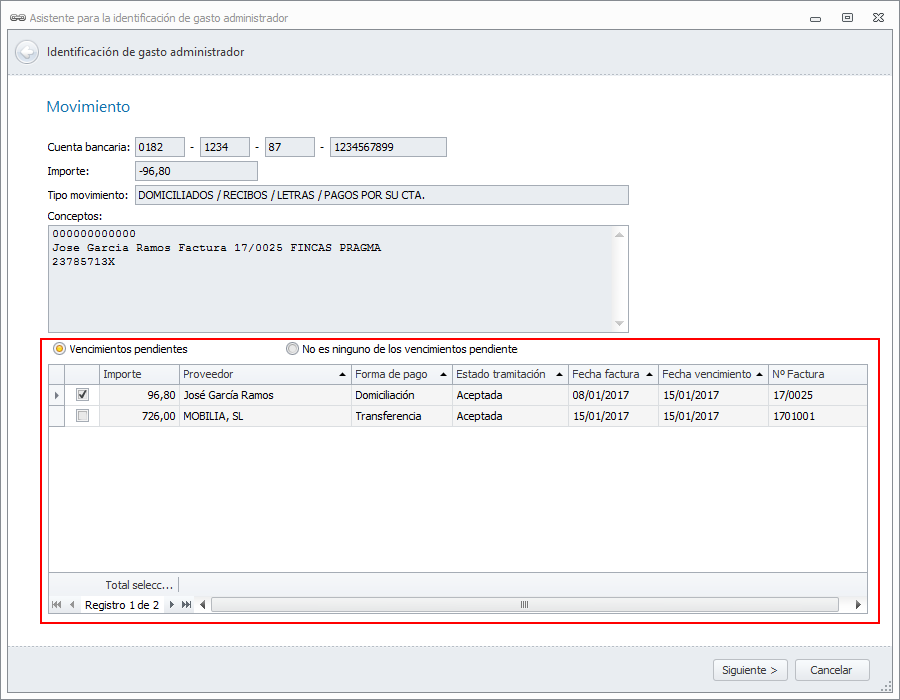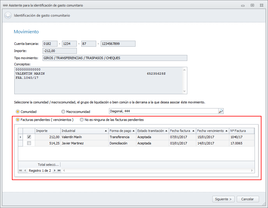 En la siguiente ventana se localizan todos los vencimientos pendientes de pago de facturas de comunidades, mostrándolos para que el usuario pueda determinar a cual o cuales corresponde ese movimiento bancario.
