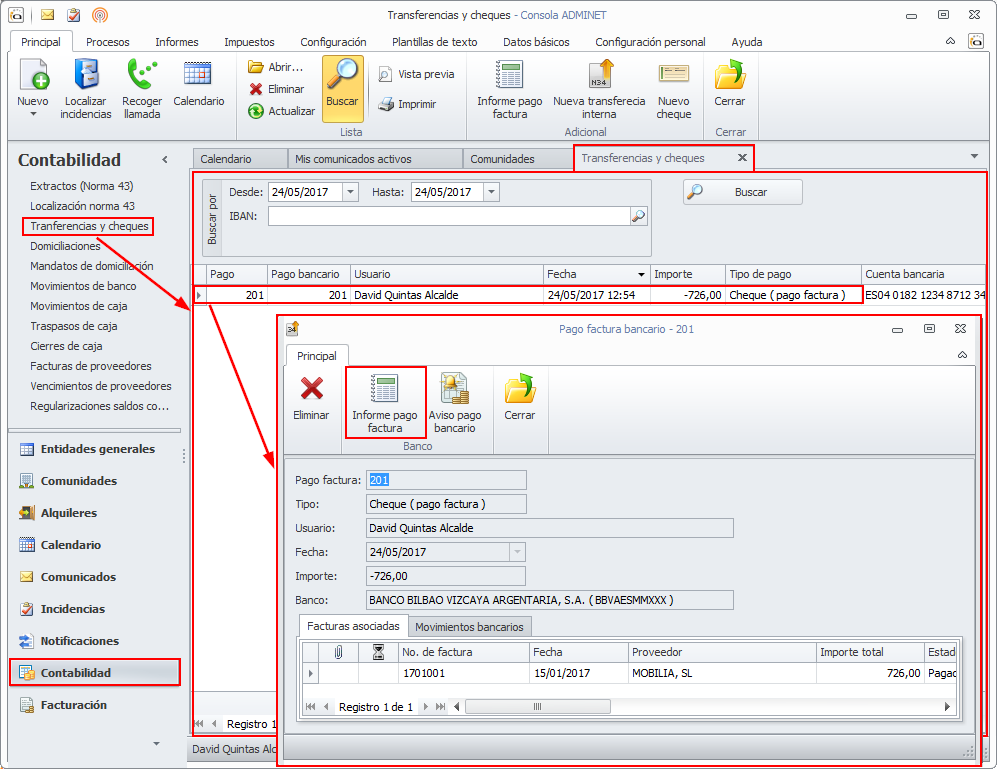 El registro de pagos realizados se puede consultar en el apartado Transferencias y cheques del menú Contabilidad. El registro de transferencias y cheques detalla las facturas pagadas en ese proceso y los movimientos bancarios que se han generado. En esa misma ventana se dispone de un botón que permite obtener un informe de ese registro de pago.