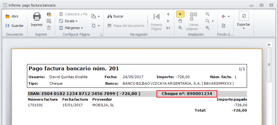 En este informe se ha añadido, sólo para el caso de pago por cheque, el número de serie del cheque.