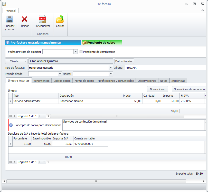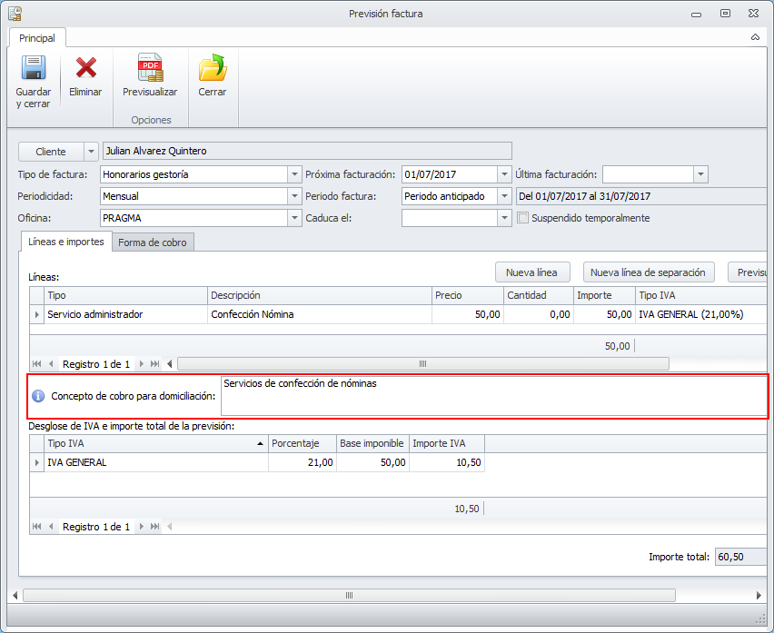 Se han modificado las fichas de previsión y de pre-factura para añadir un nuevo campo, llamado Concepto de cobro, que será únicamente visible si la forma de cobro es Domiciliación o Norma 60. El valor que se introduzca en este campo se usará: