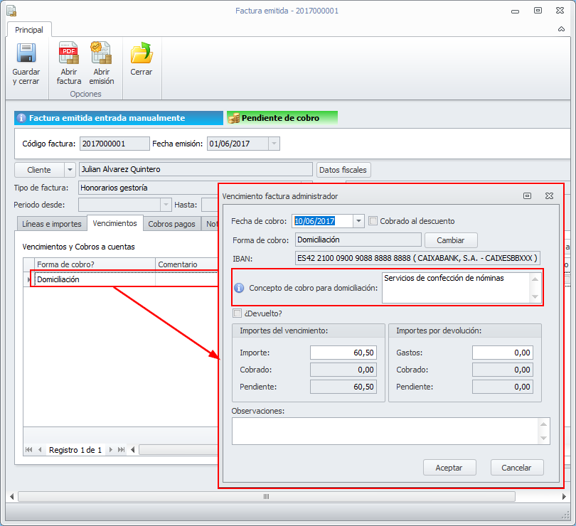 Si la forma de cobro es Domiciliación, en el fichero SEPA como concepto de la domiciliación.
