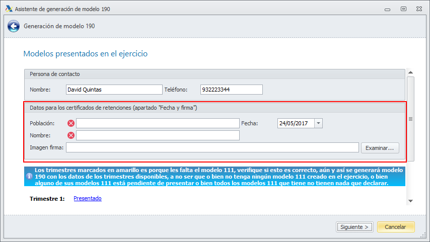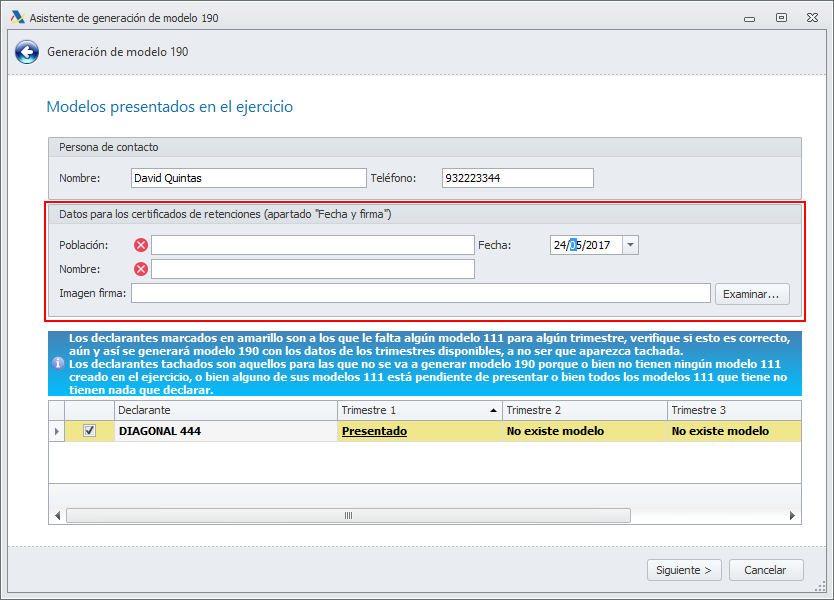 En la ventana del asistente para la generación del modelo 190 se ha incorporado un cuadro de datos para la cumplimentación de los certificados.