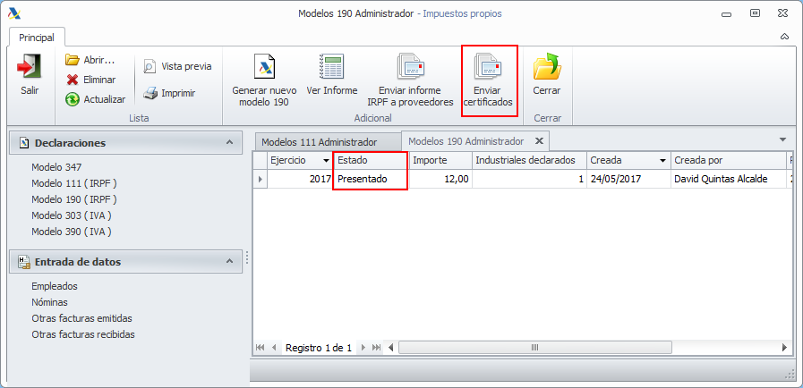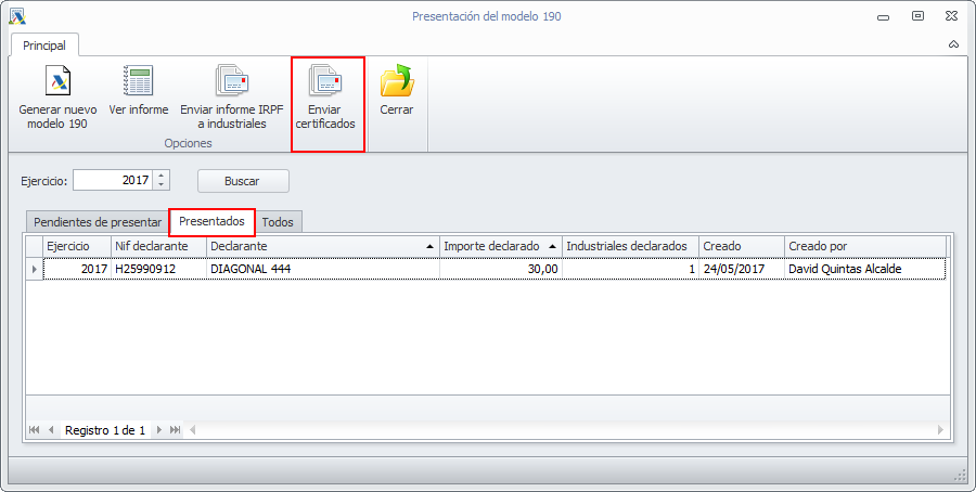 Se ha incorporado junto a la confección del modelo 190 la posibilidad de confeccionar y enviar un certificado de las retenciones aplicadas a cada uno de los retenidos. Estos certificados se confeccionan junto a la generación del propio modelo, y están accesibles a partir del momento en que se da el modelo por presentado.