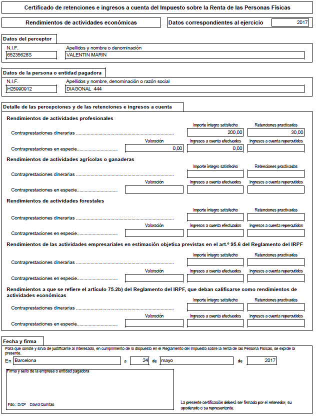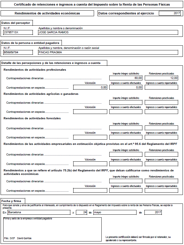 Certificado de retenciones para modelo 190 del administrador