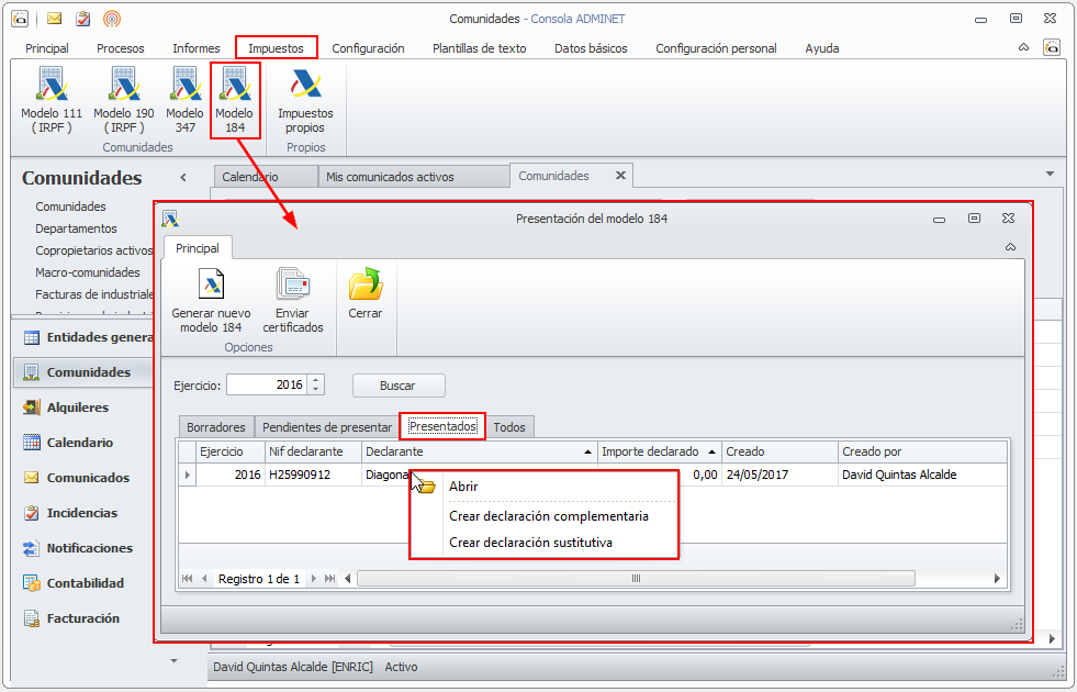 Para poder iniciar una declaración sustitutiva o complementaria es necesario tener previamente una declaración presentada con adminet. Acceda al menú de Impuestos y seleccione Modelo 184. En la ventana del modelo, vaya a Presentados y haga clic con el botón derecho sobre la declaración que desee. En el menú que se abre seleccione si desea preparar una declaración complementaria o una declaración sustitutiva,