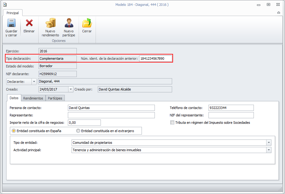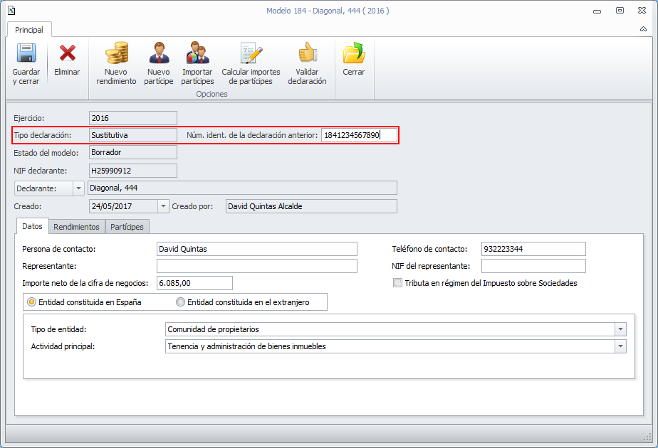 Modelo 184. Al cambiar los datos de un partícipe en un rendimiento, aplicarlo en los demás rendimientos del mismo partícipe