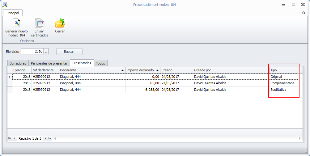 En la pestaña de modelos presentados, se ha añadido una columna que indica si se trata de una declaración original, complementaria o sustitutiva.