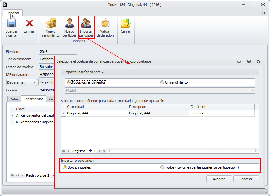 Todos los rendimientos: Importará los datos de los propietarios de la comunidad para todos los rendimientos que se hayan introducido hasta el momento.