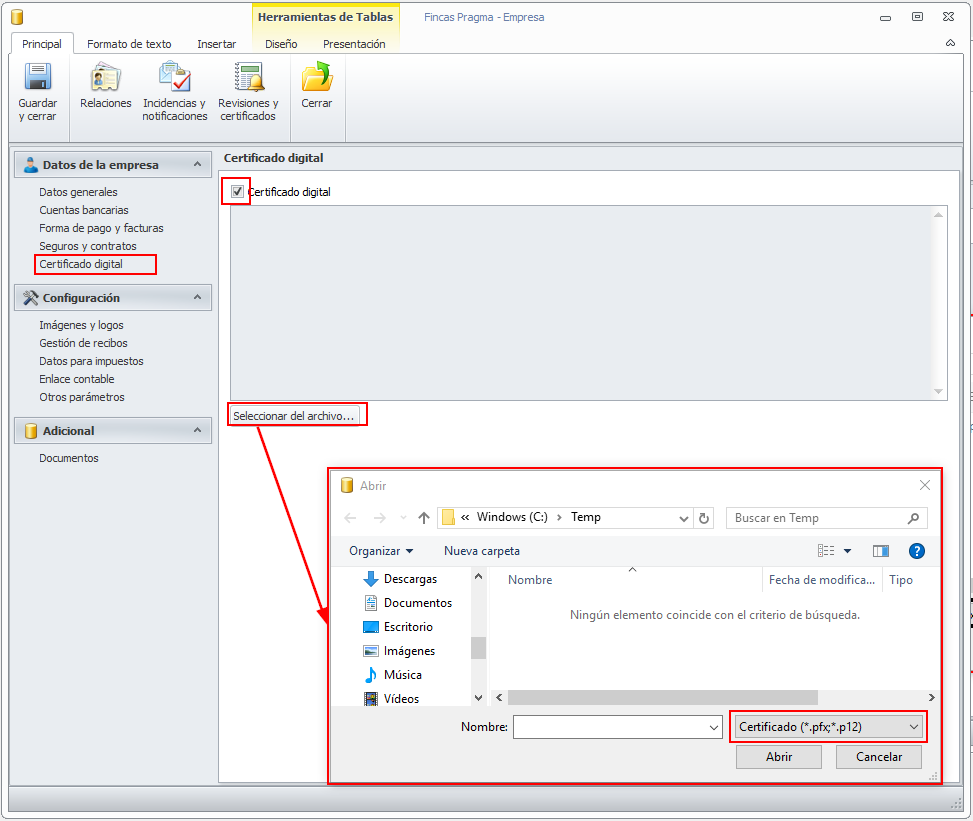 Al cargar el certificado digital en la ficha de datos empresa, además del formato pfx, ahora también se puede cargar un fichero con formato p12.