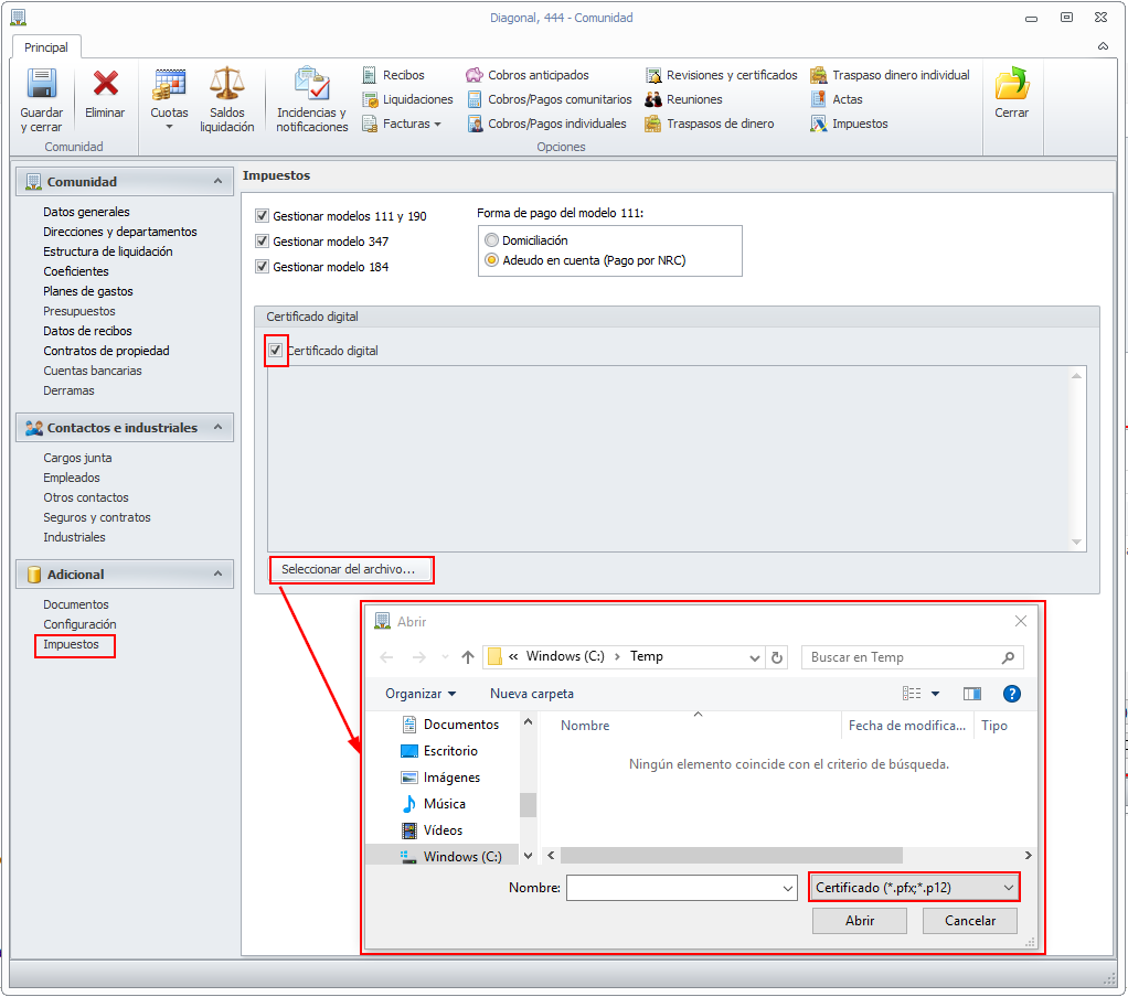 Y ahora vea donde se carga el certificado digital en la ficha de una comunidad.