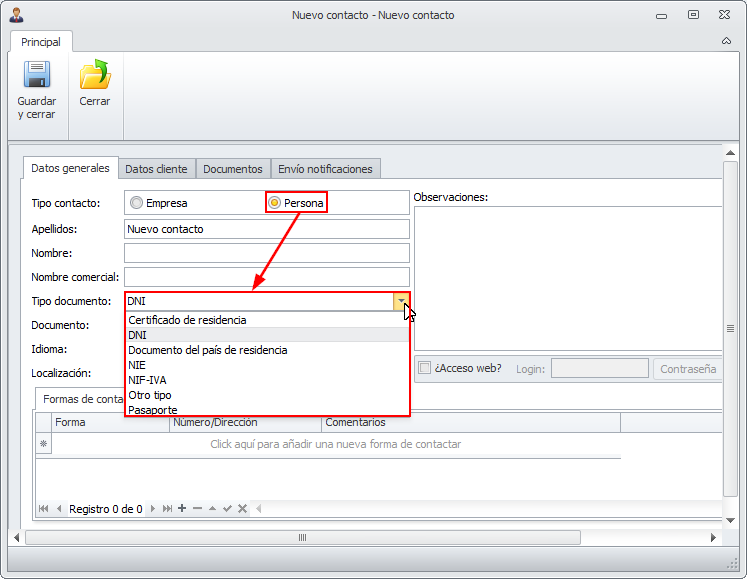 Vemos a continuación los tipos permitidos cuando el contacto o industrial es persona o empresa.