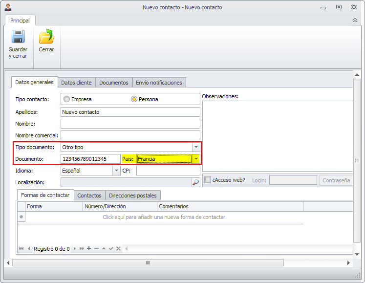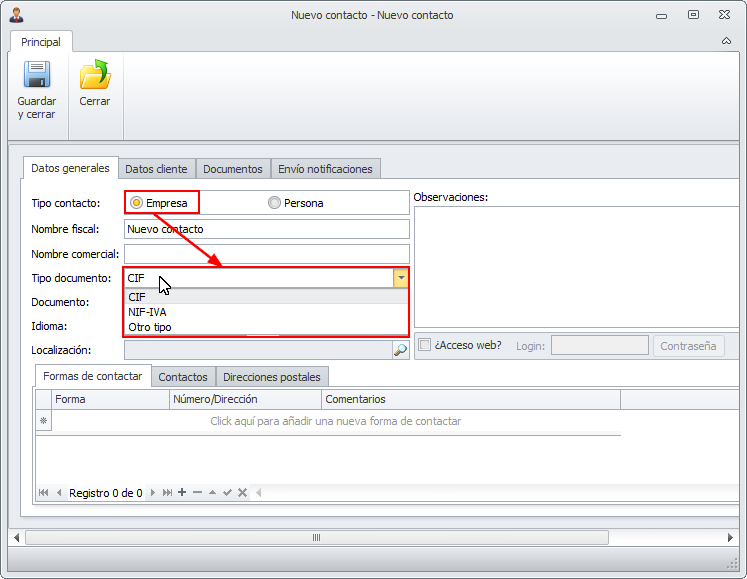 Al dar de alta un nuevo contacto o un industrial se añaden nuevos tipos de documento para contemplar las mismas posibilidades que la AEAT.