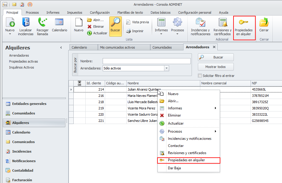 También se ha incorporado un acceso a las propiedades en alquiler en el menú contextual de la lista de arrendadores.