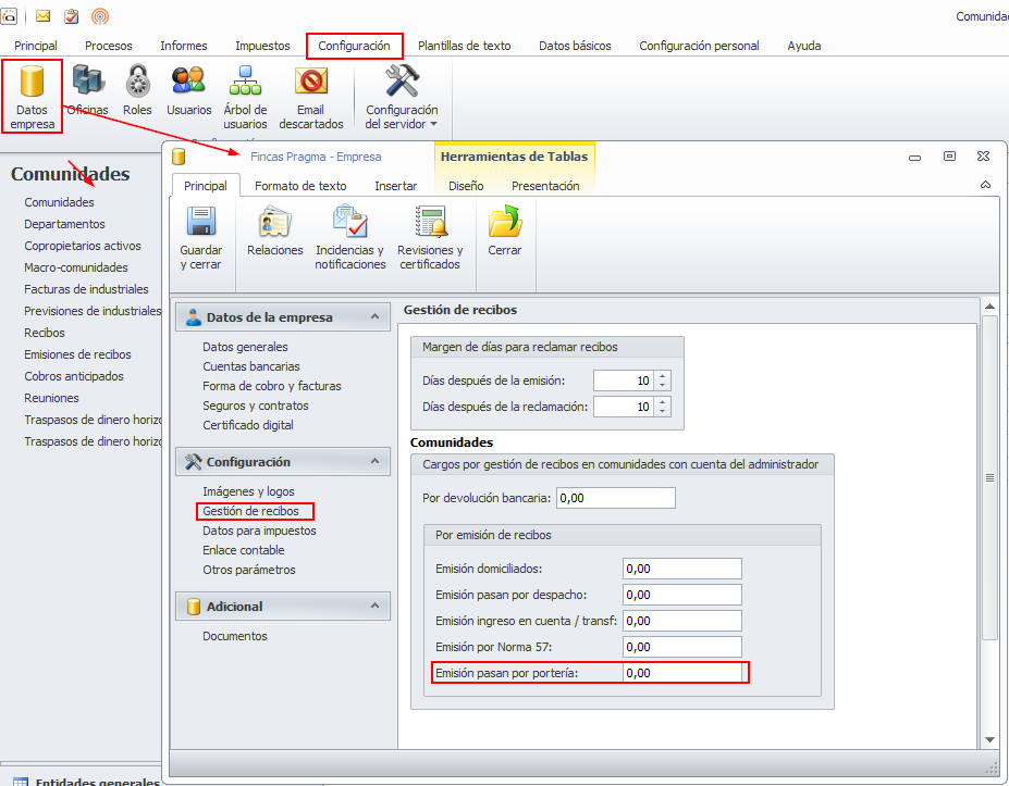 En la ficha de datos de empresa se permite indicar el importe de los gastos de emisión que se cargarán a los recibos que se emitan con esta forma de cobro y que deba ingresarse en la cuenta del administrador.
