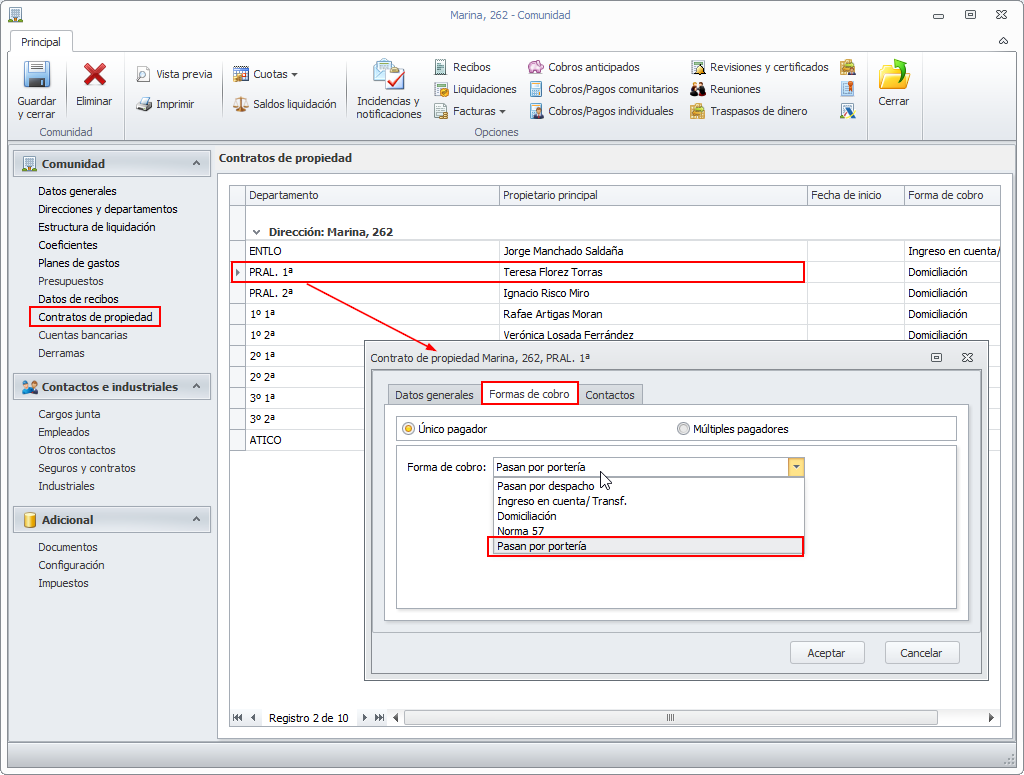 En la sección Contratos de propiedad de la ficha de la comunidad se permite escoger esta nueva forma de cobro.