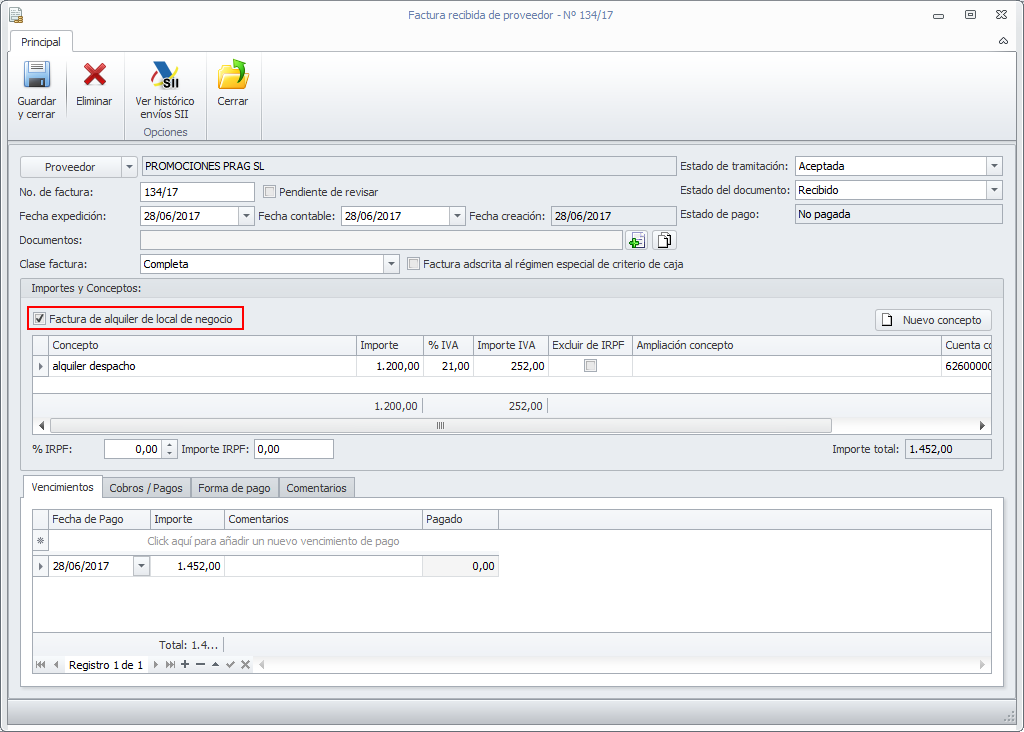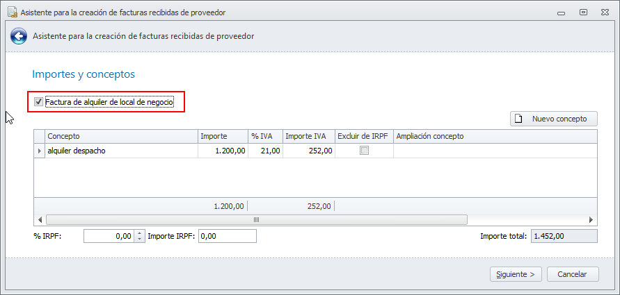 El asistente de creación de facturas de proveedores, incorpora una casilla para identificar si se trata de una factura de alquiler de local de negocio.