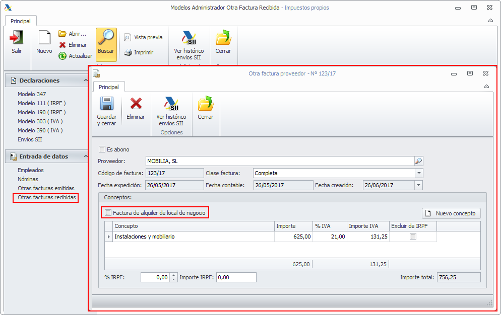 Permitir identificar facturas recibidas como facturas de alquiler de local de negocio