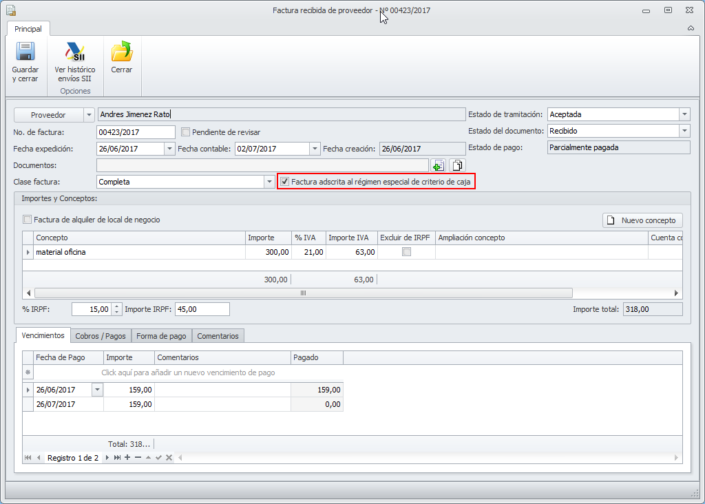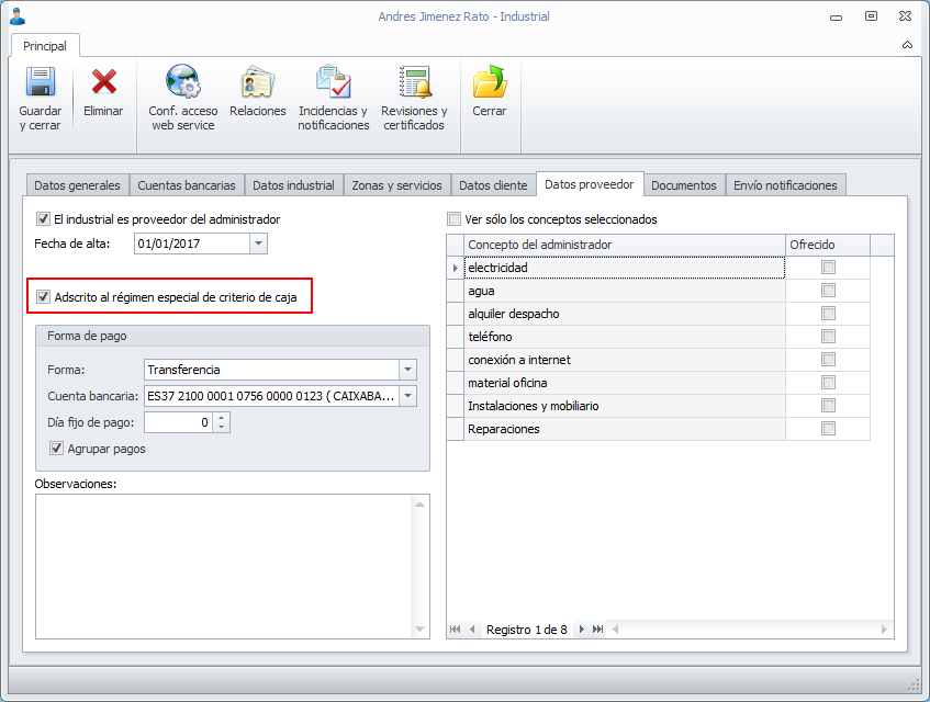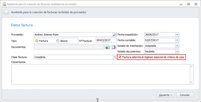 En la ficha de proveedor se ha incorporado una casilla para identificar si está adscrito al Régimen Especial del Criterio de Caja.