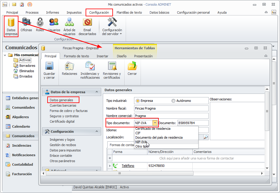 Si el administrador está dado de alta en el Registro de Operadores Intracomunitarios y va a registrar facturas de compras intracomunitarias, es necesario que vaya al menú Configuración y acceda a Datos Empresa. Una vez allí debe indicar que el tipo de documento es NIF-IVA en lugar de CIF. De este modo, al registrar las facturas de compras intracomunitarias permitirá autorrepercutirse el IVA y deducirlo, si corresponde.