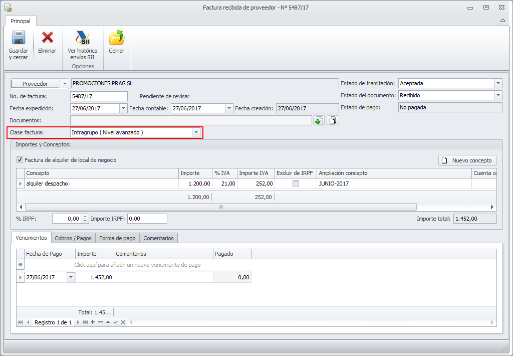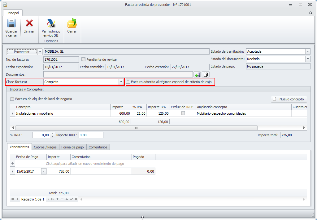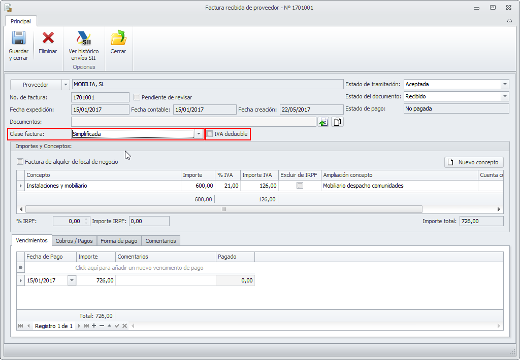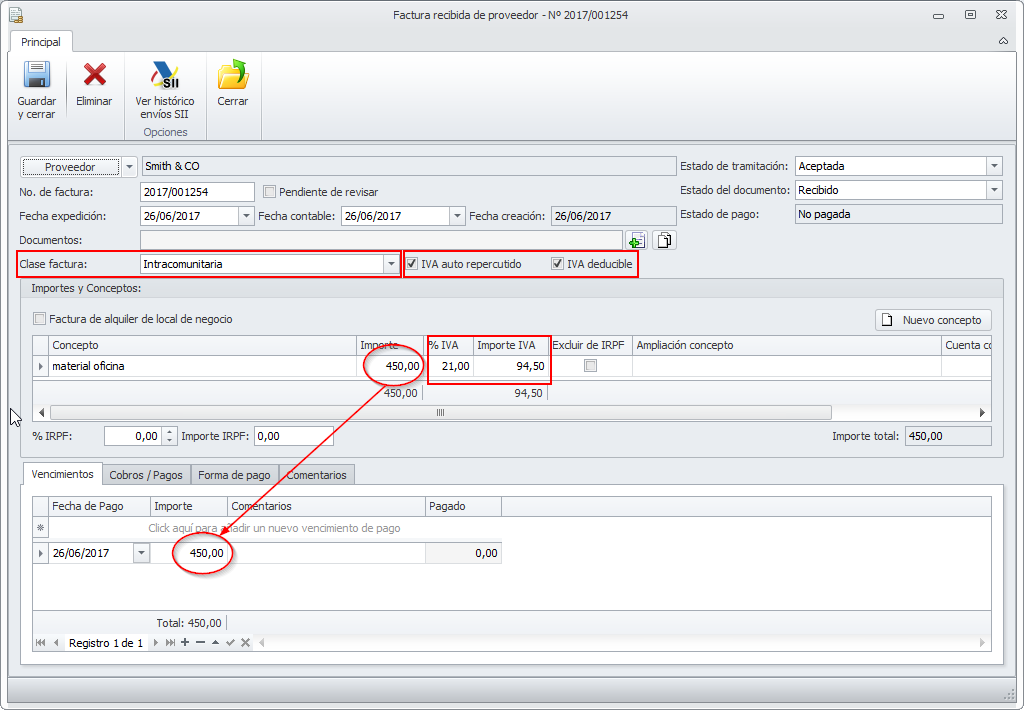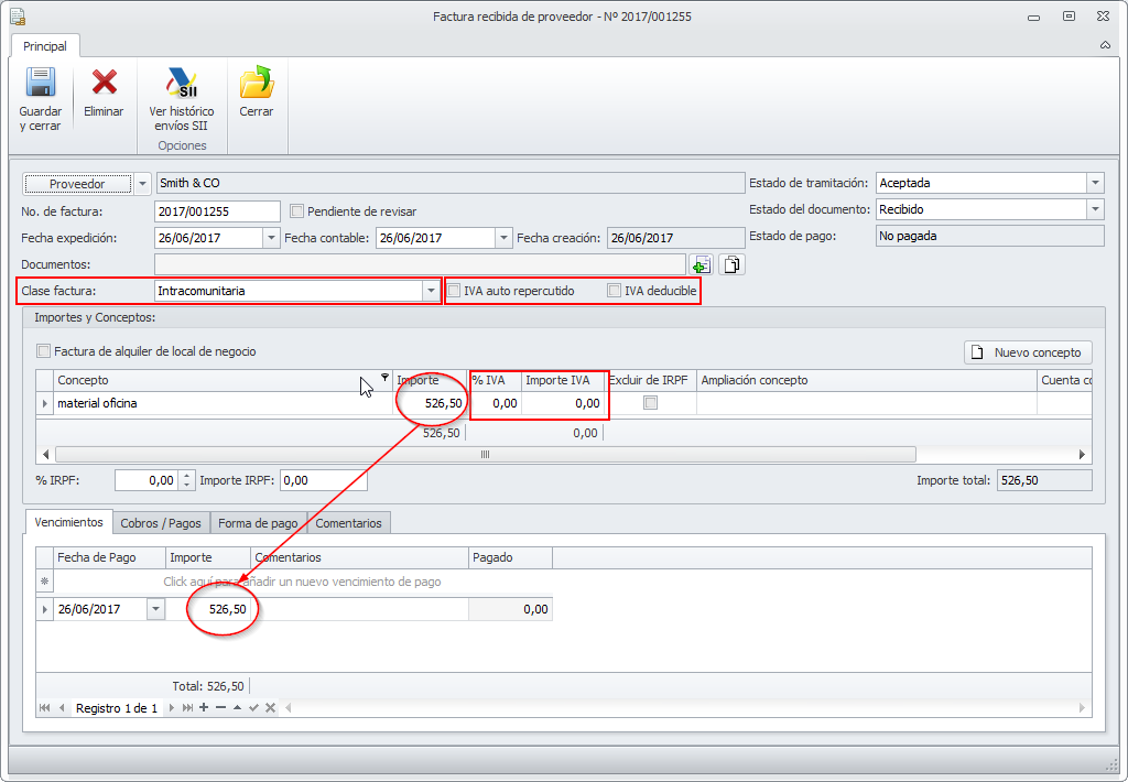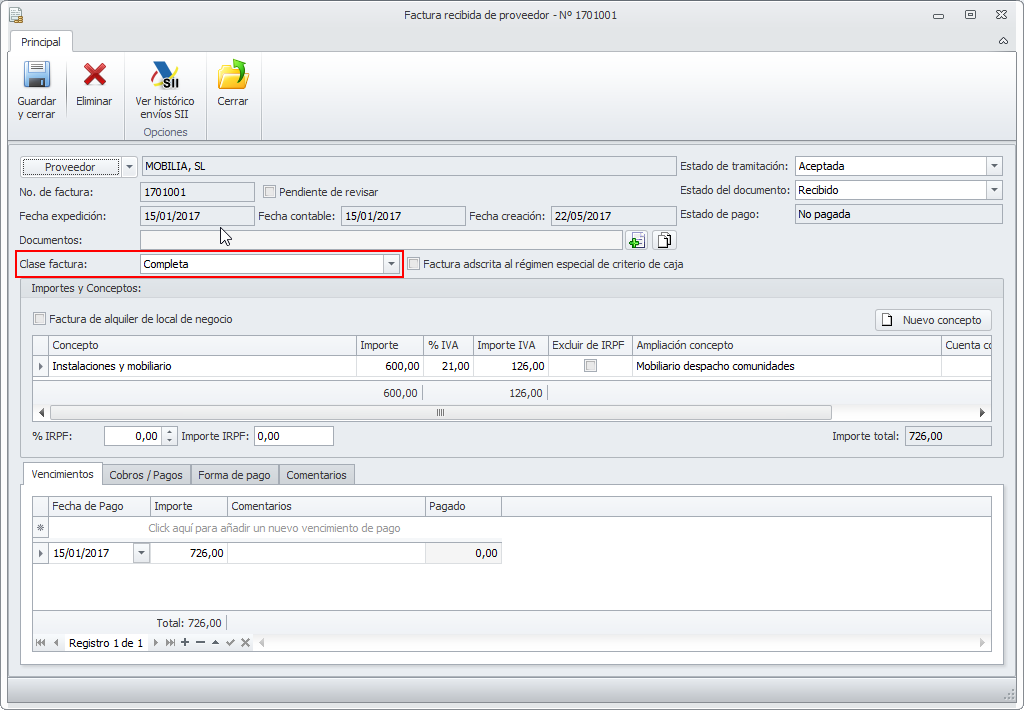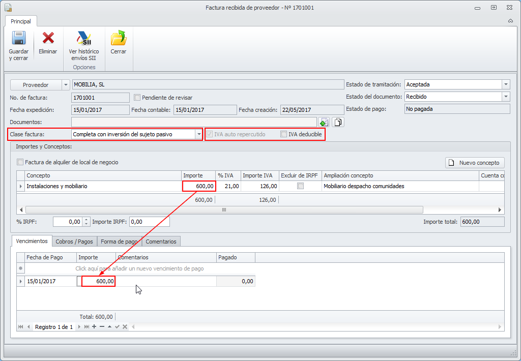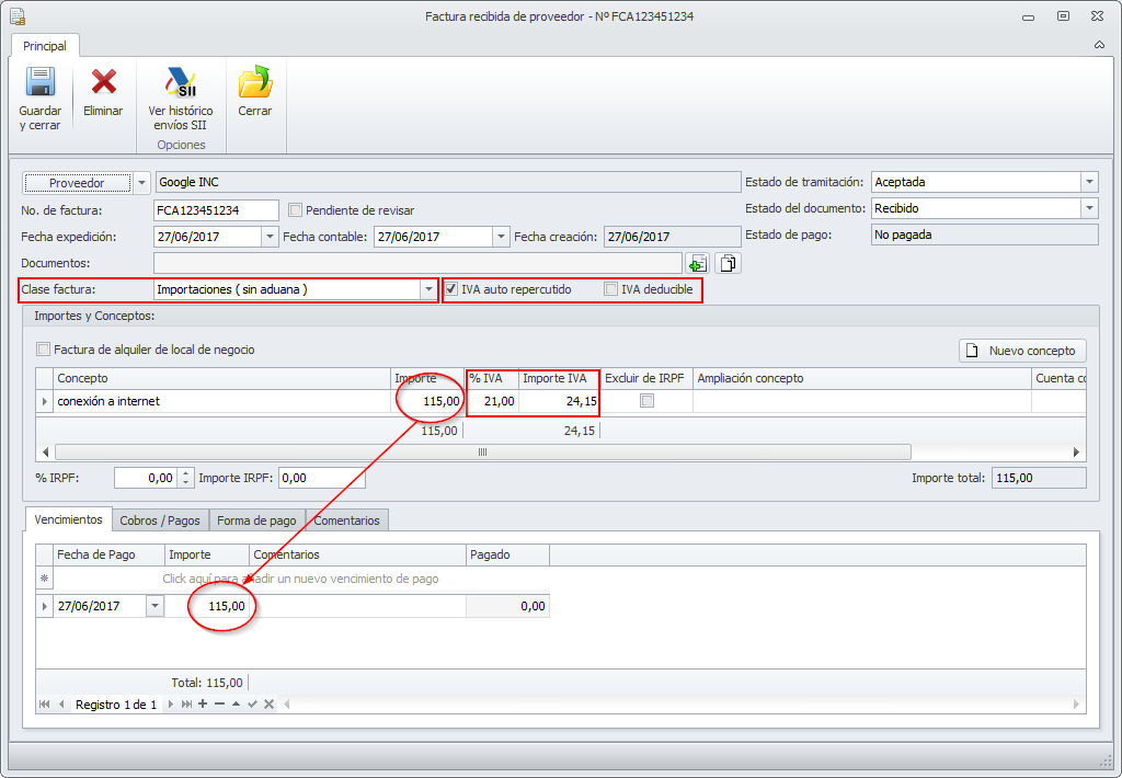 - El programa calculará el importe a pagar al proveedor y lo reflejará en el apartado Vencimientos por el importe total de la factura incluyendo el IVA.