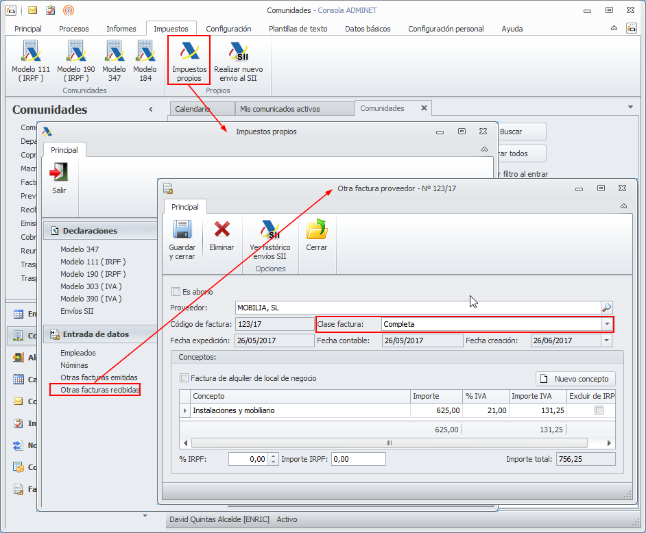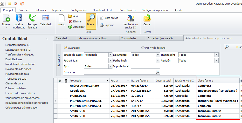 Se ha incorporado la clase de factura en la ficha de la Factura recibida de proveedor y en Otras facturas recibidas.