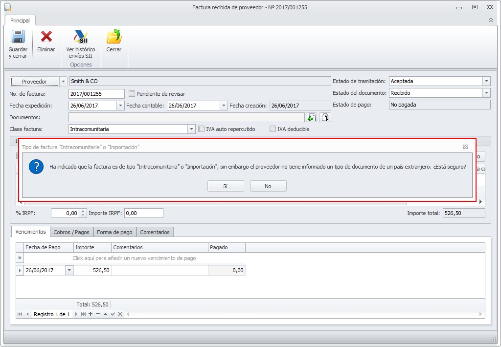 Al guardar y cerrar la factura se realizan la validaciones de la lógica de los datos, advirtiendo de las anomalías detectadas. Por ejemplo, si la factura es intracomunitaria y el proveedor no tiene un documento expedido en otro país, muestra el siguiente mensaje: