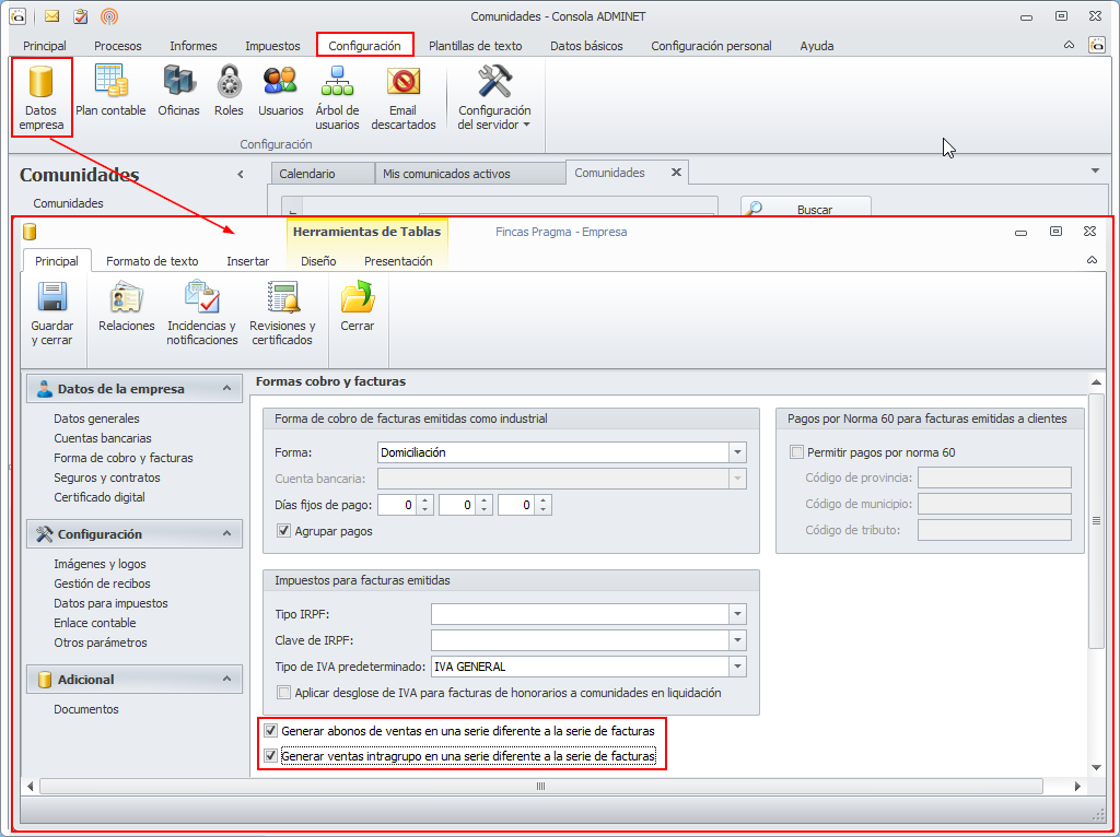 En el apartado Forma de cobro y facturas de la ficha de Datos empresa se han añadido dos casillas nuevas.