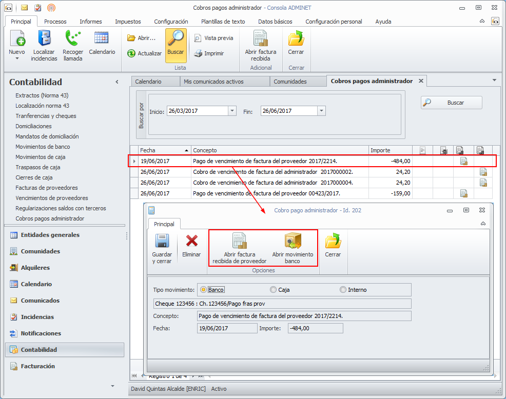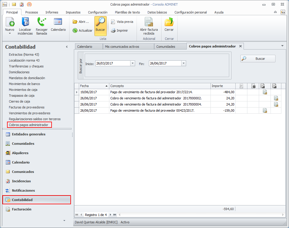 En el apartado de contabilidad se ha incorporado una opción para consultar los cobros/pagos del administrador.