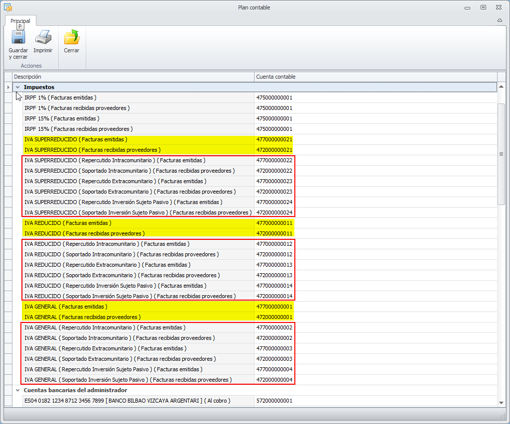 Esto permite que el IVA correspondiente a las facturas intracomunitarias, de importación y de inversión de sujeto pasivo se puedan contabilizar en cuentas diferentes a la del IVA ordinario. El IVA correspondiente a las facturas intragrupo se contabilizará en las cuentas de IVA ordinario (marcadas en amarillo)