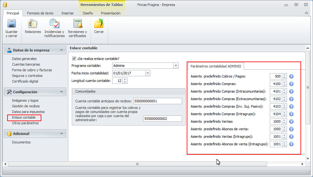 En el apartado Enlace contable de la ficha de Datos empresa, se ha ampliado la relación de asientos predefinidos de adminis con los que enlazar los diferentes tipos de facturas.