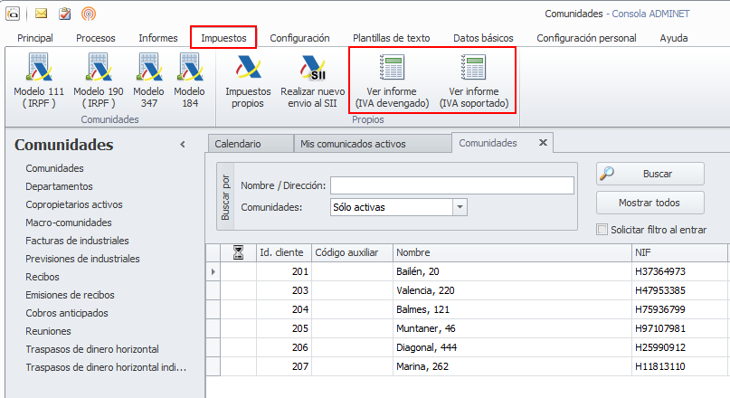 En el menú Impuestos se han añadido dos nuevos botones que permiten obtener informes del IVA Devengado y Soportado del administrador.