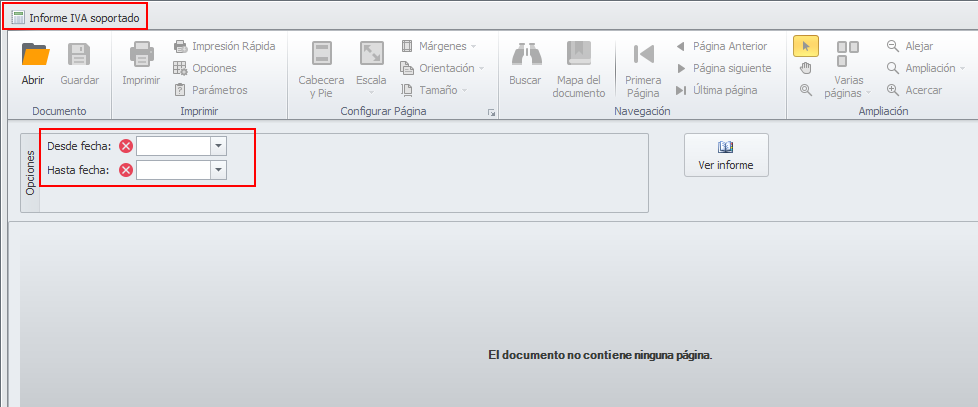 El informe del IVA Soportado separa el IVA de las facturas según la clase de las mismas, detallando en un una columna si la factura está adscrita al RECC. Este informe tiene el siguiente aspecto: