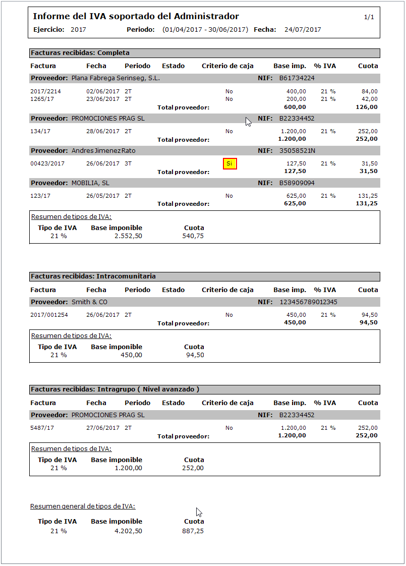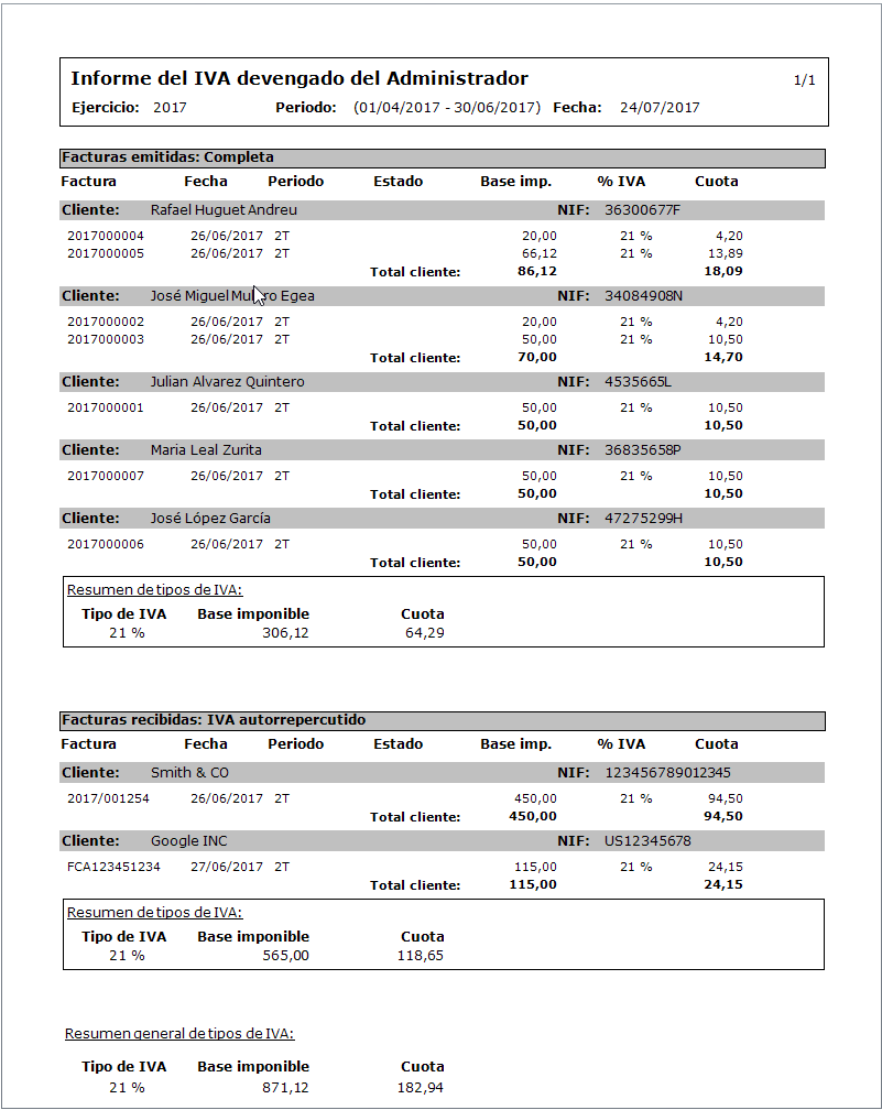 El informe del IVA Devengado separa el IVA de las facturas emitidas por el administrador del que proviene del IVA autorrepercutido en las facturas de proveedores. Este IVA autorrepercutido puede originarse en las facturas intracomunitarias o en las de importaciones. El informe tiene el siguiente aspecto: