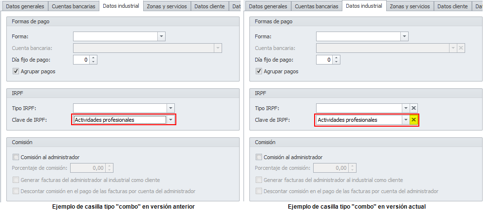 En muchas de las ventanas de la aplicación se dispone de casillas de tipo “combo”, que sirven para seleccionar una opción de entre varias. Anteriormente, una vez escogida una opción, se podía cambiar, pero no era posible volver a dejar la casilla vacía.