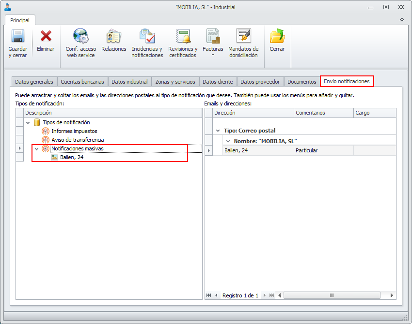 En las fichas de industriales, contactos, clientes y proveedores, se dispone de una pestaña en la que se puede predefinir la forma de envío por defecto para las notificación en algunos procesos. Entre ellos el de Notificaciones masivas.