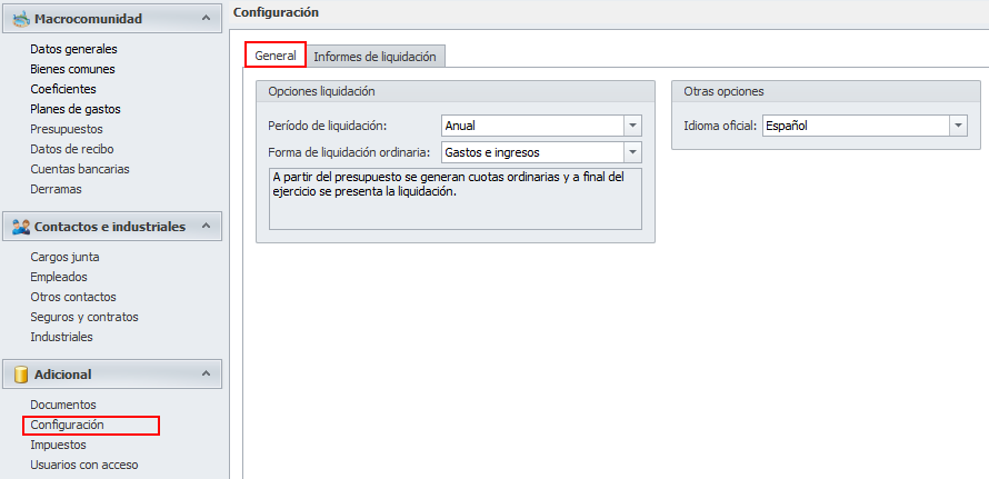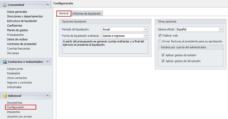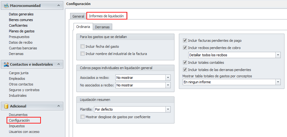 La pestaña Informes de liquidación, que se subdivide a su vez en Ordinaria y Derramas, agrupa las opciones de configuración de los informes.