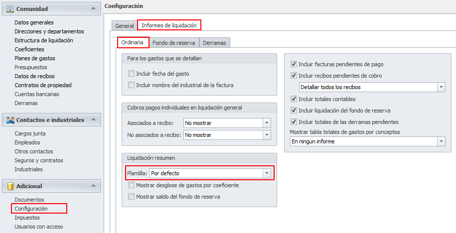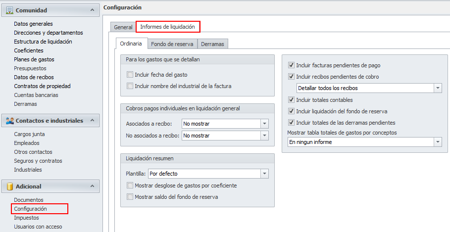 La pestaña Informes de liquidación, que se subdivide a su vez en Ordinaria, Fondo de reserva y Derramas, agrupa las opciones de configuración de los informes.