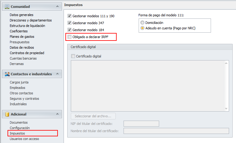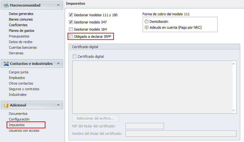 La sección Impuestos incorpora el dato Obligado a declarar IRPF que anteriormente se encontraba en la sección Configuración.