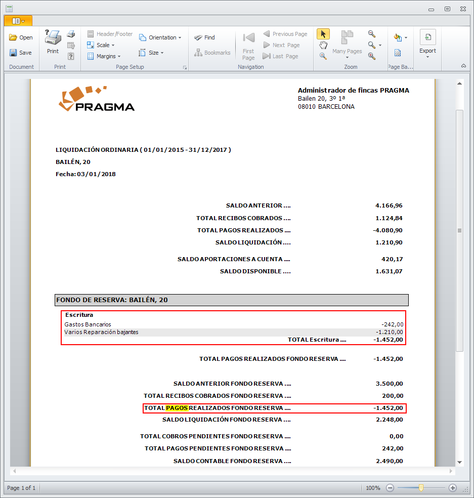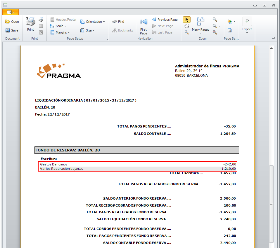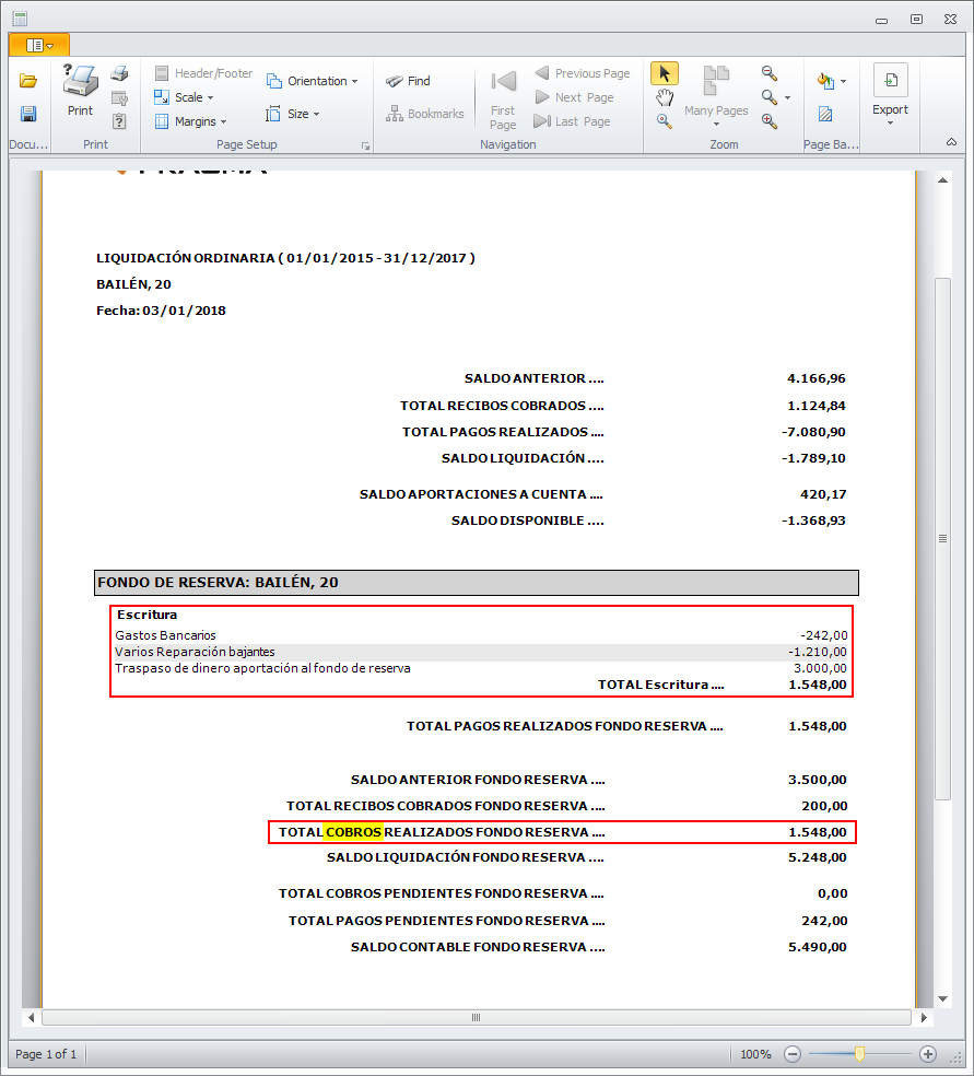 Se ha incorporado un cambio en los textos que se imprimen en el informe de liquidación. Este cambio afecta únicamente a los totales del fondo de reserva. Si el total de ingresos comunitarios es superior al de gastos comunitarios, en lugar de informarlo como Pagos realizados se informa como Cobros realizados.