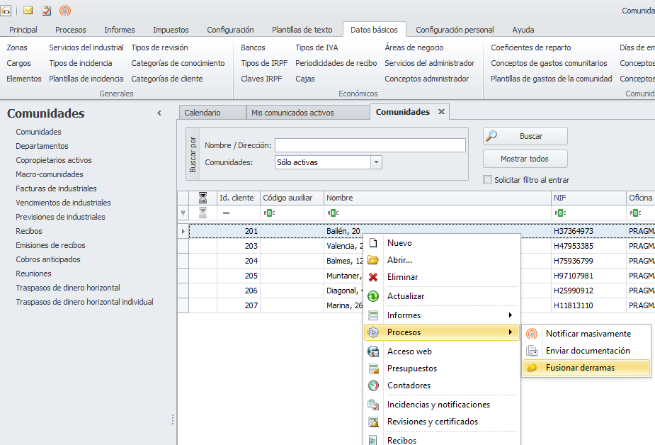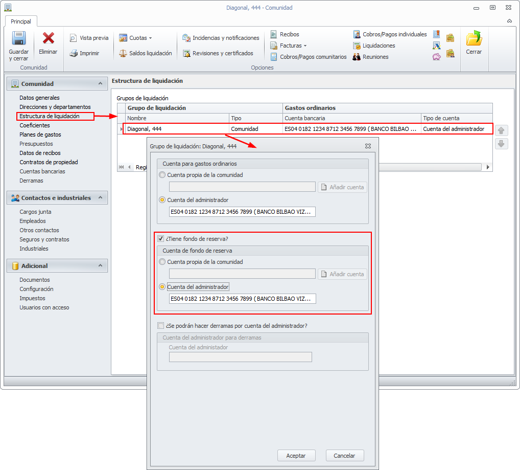 Si está activado el enlace contable en la ficha de Datos empresa, para fusionar la derrama se requerirá que la cuenta contable de la derrama y de los fondos ordinarios sea la misma, tanto si se trata de un grupo de liquidación como de un bien común.